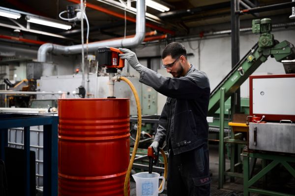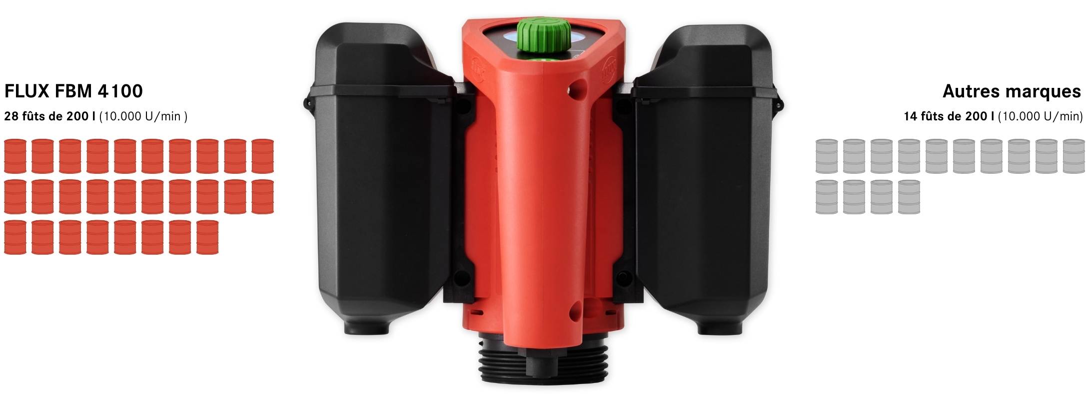 Il vide 28 fûts de 200 l à 10 000 tr/min et à écoulement libre ou 11 fûts de 200 l à 8 500 tr/min dans un kit comprenant un flexible de 2 m et un pistolet de remplissage.